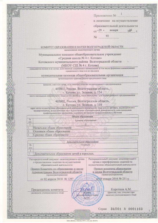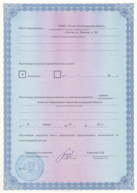 • Места осуществления образовательной деятельности по дополнительным профессиональным программам: 403802, Волгоградская область, г. Котово ул. Зеленая, д. 154